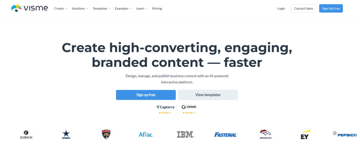 VismeWeb, iOS, AndroidEveryoneFree; Paid $12.25–$24.75/mo; Enterprise custom4.5 stars (out of 876 reviews) on G2